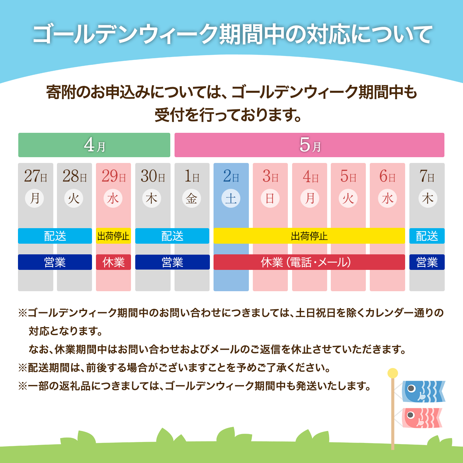※配送期間は、前後する場合がございますことを予めご了承ください。 ※一部の返礼品につきましては、ゴールデンウィーク期間中も発送いたします。